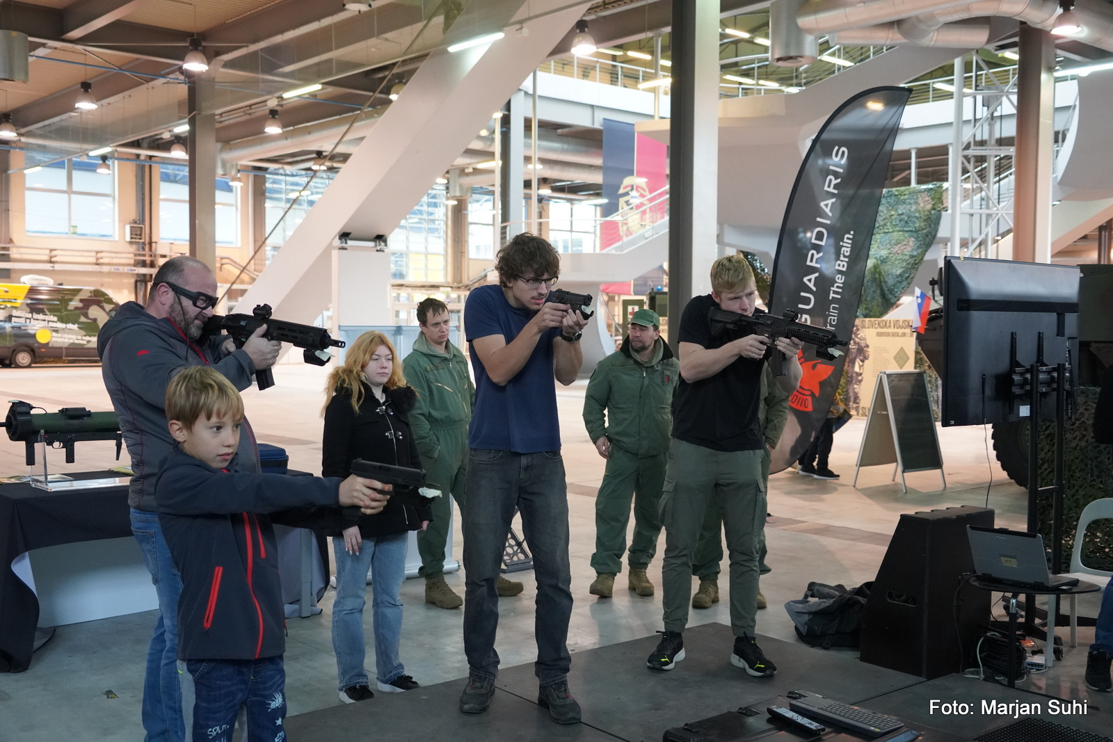 Poleg statične predstavitve boste imeli priložnost praktično preizkusiti svojo natančnost na strelskih simulatorjih za avtomatsko puško F2000S. Simulatorji služijo kot orodje za usposabljanje pripadnikov Slovenske vojske, ki na njih vadijo pravilno dihanje, merjenje in sprožanje ter izboljšujejo natančnost pred streljanjem z ostrim strelivom na strelišču. Poleg tega uporabljamo tudi vojaški simulator za protioklepno orožje Spike, na katerem se namerilci izurijo v iskanju ciljev, sledenju in vodenju rakete do cilja. Obiskovalci bodo lahko preizkusili tudi streljanje z repliko avtomatske puške FN 2000 Air Soft ter z zračno puško.